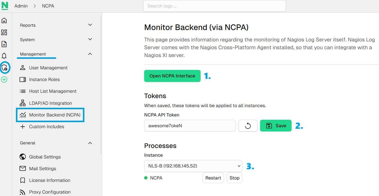 The Nagios Cross-Platform Agent (NCPA) now ships by default with Nagios Log Server. A specialized management page is also available, at Admin > Management > Monitor Backend (NCPA).